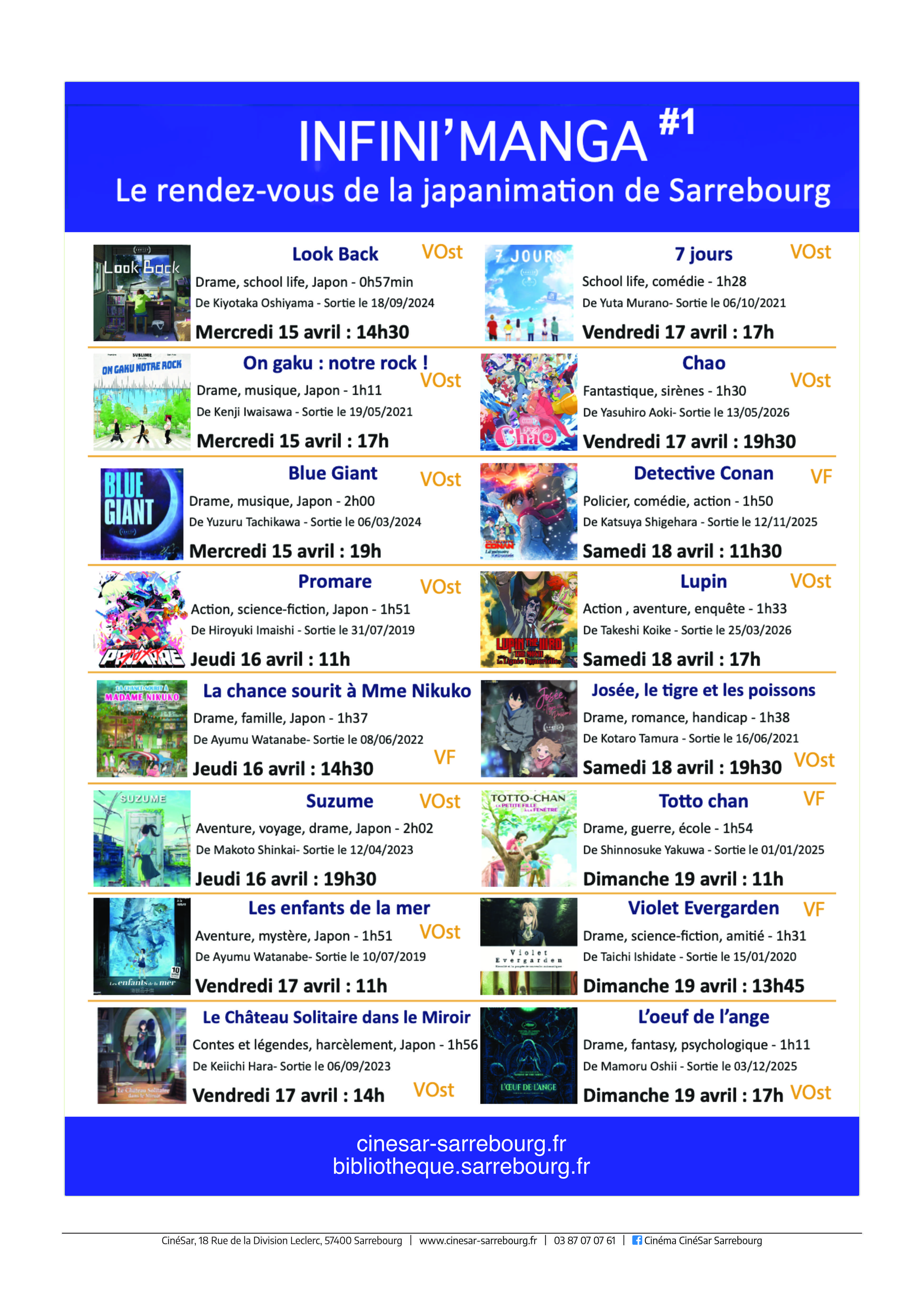 Et quoi de mieux pour cela que de faire rayonner cette part importante de la culture actuelle qu’est la japanimation ? Afin de réunir les connaisseurs et les curieux de la dernière heure, le Cinésar et la bibliothèque ont concocté un programme où chacun pourra se retrouver, avec l’aide de partenaires motivés et sympathiques : nombreuses projections d’animes, une expo, un retour nostalgique sur les premiers dessins animés, du cosplay, un marché de créateurs…et quelques autres surprises.